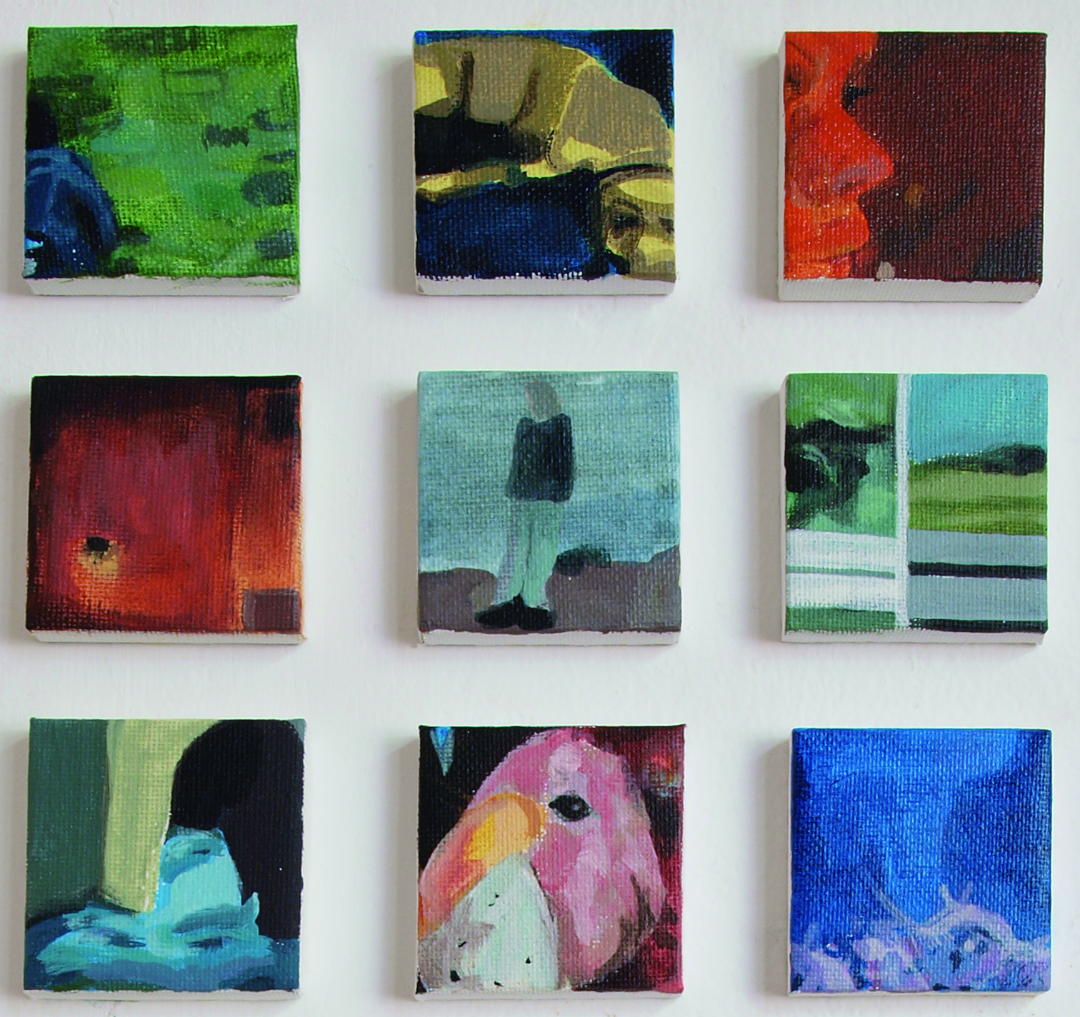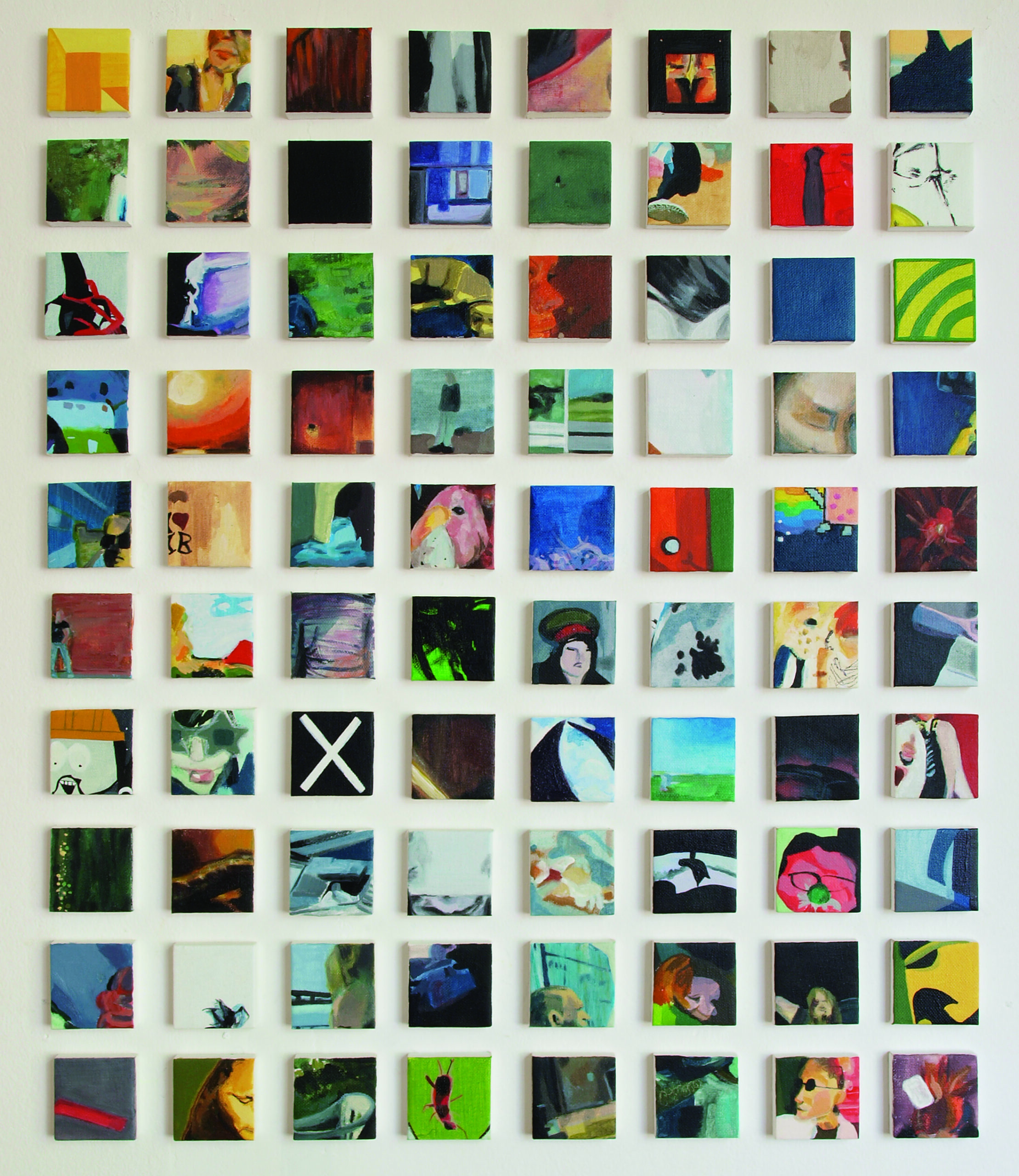 Neben diesem Aspekt der ständigen Veränderung, der auch das Verlorengehen und Wiederfinden bzw. Entdecken beinhaltet, interessierte mich malerisch vor allem eines: Der quadratische Bildausschnitt der angebotenen, potentiellen Freundesprofile ist durch seine starke Verkleinerung oftmals derart abstrahiert, dass das Auge fast ausschließlich flächige Farbvariationen wahrnimmt. Das Miniaturquadrat lässt viel interpretativen Spielraum zu. Fast könnte man den Vergleich zu der Entdeckung einer ungewöhnlichen, vielleicht fremdländischen Briefmarke in der Hauspost ziehen, die eventuell ihren Zauber verlöre, sobald man sich näher mit ihrem Ursprung und, damit zusammenhängend, dem Motiv beschäftigt. Daher erkundete ich die jeweils dazugehörigen Profile erst im Nachhinein, um mir die (abstrakte) Impression des Bildausschnitts nicht zu nehmen. Von für mich reizvollen Vorschaubildern machte ich einen Screenshot. Dadurch hielt ich einen Reiseabschnitt, nämlich meinen Besuch auf der vorgeschlagenen Seite des fremden Freundes, fest. Von der Miniatur-Vorschau angeregt, setzte ich in Acrylfarbe die für mich relevanten Muster, Strukturen und Farben auf je 5×5 cm großen Leinwänden um.