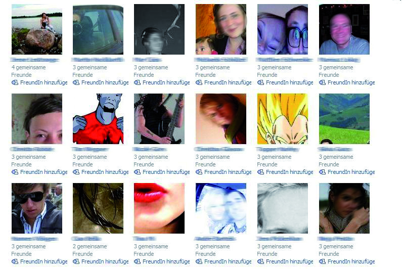 Der sich Profilierende stellt sich häufiger in ungewöhnlichen Perspektiven, extremen Anschnitten, verfremdenden Farb- und Lichtsituationen dar oder verwendet gar Ersatzmotive wie Natur, Tiere, berühmte Persönlichkeiten oder Symbole. Man könnte also meinen, die meisten Nutzer greifen eher auf ein sie nicht offensichtlich erkennbar (re)präsentierendes Bild zurück. Diese Vermutung wird von der fantastischen, bis zur Unkenntlichkeit getriebenen Reduzierung der Namen noch unterstützt: Die Profile schreien förmlich: Klicke mich an!, Lerne mich kennen!, Ich bin interessant!. Gleichzeitig sagen sie aber auch aus, dass der Mensch dahinter eine gewisse Privatsphäre wahren möchte. Facebook teilt den Profilsurfern dazu wörtlich mit: X teilt nur manche Profilinformationen mit allen.4 In einer Zeit, in der das Wort Überwachungsstaat tagtäglich für Schlagzeilen sorgt, liegt wohl eine eigentümliche Ambivalenz darin, sich in einem virtuellen, sozialen Netzwerk anzumelden und dann durch sogenannte Privatsphäreeinstellungen5 eine Mauer hochzuziehen. Es sei der plumpe Vergleich gestattet: Mauern haben noch nie die Reisewut der Menschen gebremst. Und wenn man ehrlich ist: Macht es ein Land, eine Stadt, eine Destination, ja ein Profil nicht noch interessanter, wenn man nicht alles sehen darf? Mich zumindest macht es neugierig. Stolpere ich über etwas faszinierend Merkwürdiges, dann möchte ich wissen, was es damit auf sich hat. Dies führte nun dazu, dass ich begann, mich malerisch mit Profilbildern bei Facebook auseinanderzusetzen. Dank eines ausgeklügelten Zufallsgenerators wird die Freunde finden- Liste bei diesem Netzwerk nie eintönig: die Profilbesitzer ändern in unregelmäßig zeitlichen Abständen ihre Profilbilder und die möglichen Zukunftsbekanntschaften werden immer wieder umplatziert. Lädt man die Seite erneut, ist sie völlig umstrukturiert. Man kommt sich ein wenig vor, wie auf einem Basar, der dem Prinzip eines Gordischen Knotens nachempfunden ist: Viele Menschen, die alle etwas mit einem zu tun haben (wollen), laufen einem (virtuell) wiederkehrend über den Weg. Einige sehen immer gleich aus, andere kleiden sich an jedem Stand neu ein (verändern ihre Profilbilder). Facebook spielt uns so vor, dass wir eine unüberschaubar große Auswahl an Bekanntschaften machen könnten – wenn wir denn wollten.